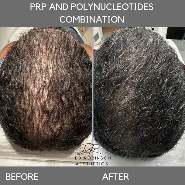 We alternate regenerative modalities across the programme, combining PRP, polynucleotides, exosomes, microneedling and Dermalux LED in a clinically considered sequence to optimise follicular stimulation and cellular signalling.